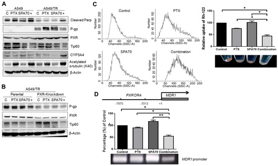 It is well documented that overexpression of transmembrane efflux protein P-gp leads to drug resistance [8,14]. We further determined P-gp expression in these PTX-resistant cell lines to test whether our developed A549/TR and H460-TR sublines have clinically relevant drug resistance properties. The results demonstrated that PXR and P-gp were indeed highly expressed in A549/TR and H460/TR cells (Figure 2A,B, Supplemental Figure S2AβC). SPA70 was shown to have a dramatically inhibitory effect on CYP3A mRNA and protein levels in LS180 cells [23]. Consistently, in A549/TR cells, CYP3A4 protein levels were also strongly inhibited (Figure 2A, Supplemental Figure S2A). We also noticed elevated PXR expression in resistant cell lines, and knockdown of PXR correspondingly decreased with P-gp expression (Figure 2B, Supplemental Figure S2B), which is consistent with the role of PXR in the regulation of P-gp [27]. The combined administration of PTX and SPA70 inhibited P-gp protein expression (Figure 2A, Supplemental Figure S2A). Since Rh-123 acts as a P-gp substrate and it can serve as an indicator of efflux activity of P-gp, flow cytometry analyses revealed that there was a lower accumulation of Rh-123 in the combination treatment group (Figure 2C), which seems contradictory with decreased P-gp expression. However, there was remarkable cell death induced by the combination treatment (Figure 1B), and both uptake of Rh-123 and P-gp activity might be abrogated, which explains the parallel changes of P-gp and Rh-123 accumulation in A549/TR cells. Furthermore, as shown in Figure 3C, SPA70 had no effect on Rh-123 accumulation, which excluded the possibility that SPA70 is a P-gp substrate. We next performed chromatin immunoprecipitation assay (ChIP) assays to analyze the effects of combination treatment on the regulatory effects of PXR in the MDR1 promoter; our results revealed that the combination treatment indeed disassociated PXR from the promoter region of MDR1, leading to dramatically diminished mRNA expression of MDR1 (60% of that in the control group) (Figure 2D). Western blot results revealed that the combination regimen dramatically increased the expression level of cleaved PARP in both sensitive and resistant cell lines (Figure 2A), suggesting the apoptosis of the cancer cells resulted from combination treatment.