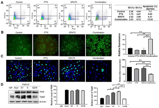 Combination treatment induces apoptosis and compromises EdU incorporation. All the experiments were conducted with 2 nM PTX, 10 ΞΌM SPA70, or combined usage for 48 h. (A) Combination regimen induced the highest apoptosis in A549/TR cells within all groups as shown by annexin V-FITC/PI staining. Apoptosis fraction was calculated by the summarization of coverage percentage in Q2, and Q3. (B) Combination regimen produced the highest ROS level in A549/TR cells among all groups by DCFH-DA probe incubation with live cells. The photographs were taken by fluorescence microscopy (200Γ). (C) Combination regimen inhibited EdU incorporation in A549/TR cells among all groups. Merged images with green (EdU-488) and blue (DAPI) were displayed and EdU fluorescence staining was quantified. The photographs were taken by fluorescence microscopy (200Γ). (D) Combination regimen-treated cells were held in different cell cycles and precipitated with the indicated antibody. Western blot detection shows increased interaction between Tip60 and PXR mainly in S-phase. *, p < 0.05; **, p < 0.01, compared with indicated groups. Ns means no statistical significance.