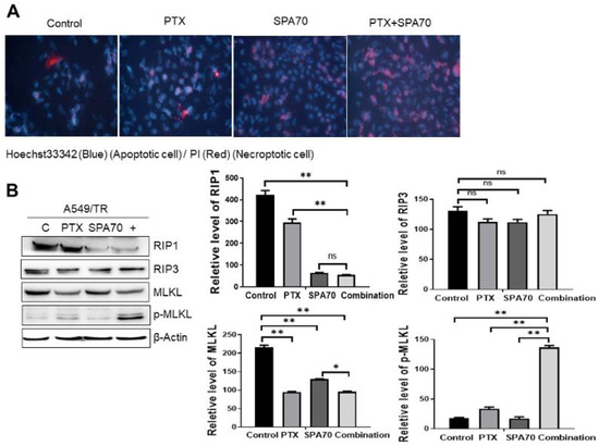 SPA70 and combination regimen induces necroptosis and exacerbates cell death. All the experiments were treated with 2 nM PTX, 10 ΞΌM SPA70, or combined regimen for 48 h. (A) Merge pictures showing Hoechst 33342 (specifically stains apoptotic cells) and PI (specifically stains necroptotic cells) staining in all indicated groups. The photographs were taken by fluorescence microscopy (200Γ). (B) Western blot analysis of classic RIP1-RIP3-MLKL pathway in all treatment groups (n = 3). β+β indicates combination treatment of PTX and SPA70. *, p < 0.05; **, p < 0.01, compared with indicated groups. Ns means no statistical significance.