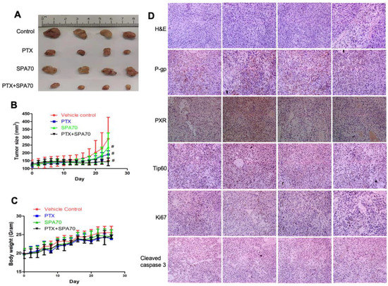 Additive effect of PTX and SPA70 in PTX-resistant A549/TR xenograft tumor growth. BALB/c-Nude mice were treated with 5 mg/kg paclitaxel with or without SPA70 intraperitoneal injection three times per week. (A) The photograph of xenograft tumors in all groups. (B) The volume of the xenograft tumors from the combination group was remarkably smaller than the vehicle control and single compound groups. #, p < 0.05, compared with vehicle administration groups. (C) Mice body weight curves over drug administration time period. (D) H&E and IHC staining of tumor tissues revealed remarkably reduced expressions of P-gp, along with diminished PXR and Tip60 expression, decreased proliferation (Ki67), and increased cell apoptosis (cleaved caspase 3) in the combination treatment group. The photographs were taken by microscopy (200Γ).