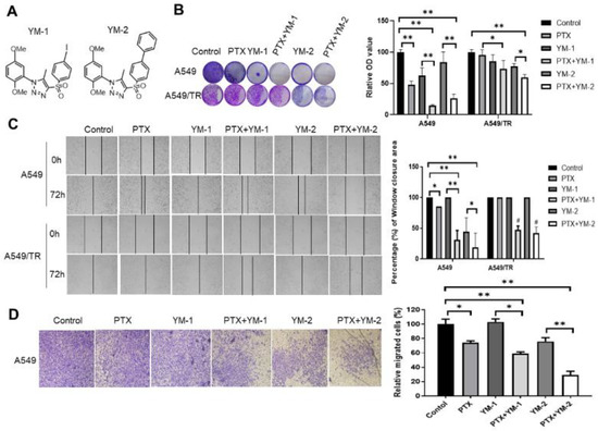 Two SPA70 derivatives also have synergistic effects with PTX in parental A549 and PTX-resistant A549/TR cells. (A) Chemical structure of two SPA70 derivatives YM-1, YM-2. (B) Representative pictures of the colonies in different groups, and the quantification of A549, A549/TR cells was shown as a bar graph (n = 3). A total of 1 nM PTX, and/or 5 ΞΌM YM-1/YM-2, were applied in 12-well plates with triplicates for 8β10 days. Crystal violet-stained colonies were lysed in buffer and the absorbance was recorded at 490 nm. *, p < 0.05; **, p < 0.01, compared with indicated treatment groups. (C) In the wound healing assay, 2 nM PTX and/or 10 ΞΌM YM-1/YM-2 were applied to the cells for 72 h. The migrated cells across the scratch line were recorded and quantified as shown in the right panel. *, p < 0.05; **, p < 0.01, compared with indicated treatment groups. The photographs were taken by microscopy (200Γ). (D) Transwell invasion assay was carried out to evaluate the inhibitory effects of YM-1 or YM-2 combined with PTX on cell invasion in parental A549 cells. The invaded cells were counted as Figure 2D. The photographs were taken by microscopy (200Γ). *, p < 0.05; **, p < 0.01, compared with indicated treatment groups.