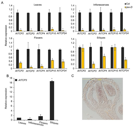 Notably, TCP4 and TCP24 were also significantly repressed in silique of jaw-D plants compared to Col-0 (Figure 2A). Knockout mutants of AtTCP3 showed no visible phenotypic alterations due to the functional redundancy of the miR319-target TCPs [43,44]. To further confirm the function of AtTCP3 in repla development, we constructed the pAtTCP3::AtTCP3SRDX transgenic line fusing TCP3 with plant-specific ERF-associated amphiphilic repression (EAR) motif repression domain (SRDX), which suppressed target genes of endogenous TCP3 and its functionally redundant TCPs. We found that the replum width of the pAtTCP3::AtTCP3SRDX siliques was similar to jaw-D siliques (Figure 1C). These results further suggested that miR319-regulated TCPs played critical role in replum development in siliques.