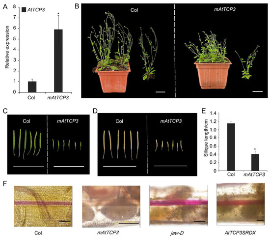 To further study the function of TCP3 in developing siliques, a miR319a-resistant version (p35S::mAtTCP3) of AtTCP3 was introduced into Arabidopsis. As expected, the AtTCP3 transcription level was significantly increased in the transgenic plants compared with wild-type (Figure 3A). In wild-type siliques, valve margins or DZ were differentiated as a narrow strip consisted of few cells within the separation layer and the lignified regions, both of which contributed to the active fruit-opening process [19]. Consistent with the previous studies [43], p35S:mAtTCP3 plants were smaller than wild-type plants (Figure 3B), and their siliques were much shorter (Figure 3C–E). Based on the SEM image of siliques (Stage 17), the repla of p35S:mAtTCP3 siliques were much narrower than those in wide type and jaw-D siliques (Figure 1A). Cross sections in the middle of siliques also showed that the replum cells were relatively smaller in p35S:mAtTCP3 siliques than in wild type and jaw-D. In addition, a layer of large and sparse cells were seen between the valve and the replum in the Col silique, which facilitated the dehiscence of the siliques, whereas this layer of cells was much denser in p35S::mAtTCP3 siliques (Figure 1B). These results suggested that AtMIR319a-regulated TCP3 functioned as a negative regulator of silique development.