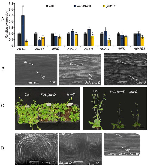 The relationship of miR319a and AtTCP3 with replum- and valve-related genes. (A) Real-time PCR showing the relative expression levels of AtFUL, AtNTT, AtIND, AtALC, AtRPL, AtJAG, AtFIL, and AtYAB3 in p35S::mAtTCP3 and jaw-D siliques. (B) SEM images showing repla in the siliques of FUL and FUL jaw-D plants (p35S::AtFUL in jaw-D mutant). (C) The phenotypes of FUL jaw-D plants. (D) SEM images showing repla in siliques of ful, ful jaw-D, and pAtTCP3::AtTCP3SRDX plants. AtTCP3SRDX indicates pAtTCP3:: AtTCP3SRDX. The relative transcript level of each gene was normalized to Actin cDNA for quantification. Error bars indicate the standard errors. The asterisks indicate a significant difference (* p < 0.05).