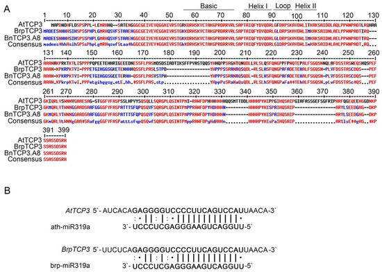 Alignment of putative TCP3 proteins in Arabidopsis thaliana, B. rapa, and B. napus and miR319a target sites of AtTCP3 and BrpTCP3. (A) Amino acid sequence alignment of TCP3 proteins in Arabidopsis, B. rapa, and B. napus. The TCP domains are represented by black solid lines. (B) Reverse complementation between mature miR319a and TCP3 mRNA.
