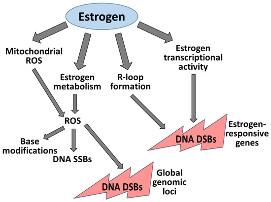 Estrogen and estrogen-related pathways are associated with genomic instability. One of the mechanisms by which estrogen triggers genomic instability is the induction of DNA damage in cells during estrogen stimulation. Estrogen induces DNA damage in cells by several manners, all of which may result in DSBs, which may occur in estrogen-responsive genes of at global genomic regions (Figure 1):