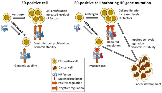 In the case that a cell has a germline mutation in a gene encoding a member of the HRR pathway, the fine-tuning of the estrogen response will be impaired and the proliferative effect of ERα signaling will not be properly regulated. Estrogen will induce cell proliferation in these cells, and will augment the expression of HRR genes. However, since there is a germline mutation in one of the HRR genes, there will probably be insufficient activity of this factor, resulting in a faulty activation of the HRR pathway. On top of that, since estrogen supplementation induces DSBs at estrogen-responsive genes [63,64,65,66], and thus at genes encoding to HRR factors, the chances for additional mutations at HRR genes increases. Moreover, we found that in ER-positive cells, DNA damage augments levels of HRR factors in the absence of estrogen. Thus, similarly to what occurs due to the presence of estrogen, in cases of a germline mutation in a HRR gene, there will be no increased activity of the mutated HRR factor upon DSB induction. This will result in impaired DSB repair. The above will result in accumulation of mutations and chromosomal aberrations, which will trigger cancer formation (Figure 3). Indeed, BRCA1 mutations, as well as mutations in other HRR genes, predispose genomic instability and trigger cancer formation. Recently, it was shown, in a mouse model, that genomic instability in BRCA1 heterozygous mice appears already at 10.5-day embryo and progressively towards adulthood. Interestingly, accumulation of genomic instability is not linear and there are many dynamic changes during the embryonic stage [91].