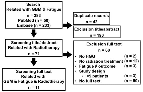 A literature review was conducted to find evidence that GBM patients who received radiotherapy were likely to develop cancer cachexia. Data sources were “PubMed” and “Embase”. This paper includes search conditions GBM and fatigue, and detailed search terms are listed in Table S1. A total of 283 related papers were selected as a result of performing an initial search with the relevant search term. Among them, 71 papers were selected, excluding duplicate papers and papers that were incorrectly searched in title or abstract. Here, papers related to radiotherapy were selected. At this time, papers that were not high-grade glioma, papers without radiotherapy, papers without fatigue symptoms, papers with fewer than 5 patients, and papers without full text were excluded. Through this process, 11 related papers were finally selected, and the flow is shown in Figure 1. As a result of the analysis of 11 papers, it was found that 178 of the 520 GBM patients who received radiotherapy experienced 1st–2nd stage fatigue, and 99 patients experienced 3rd–5th stage fatigue.