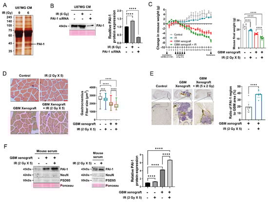 PAI-1 expression and secretion were elevated in irradiated GBM cells and an IR-induced GBM cachexia mouse model. (A) The secretome in CM of U87MG cells exposed to 6 Gy was analyzed by silver staining and proteomics using mass spectrometry. The band indicated by an arrowhead corresponds to the PAI-1 protein, which was increased by irradiation. (B) Radiation-induced expression levels of the PAI-1 protein in CM of U87MG cells and treated with PAI-1 siRNA were analyzed by western blotting (left panel), and the PAI-1 protein was quantified (right panel). (C) Mouse body weight analysis on in vivo in a xenograft mouse model and irradiated xenograft mouse model. Balb/c nude mice were inoculated with 5 × 105 U87MG GBM tumor cells and irradiated 2 Gy daily for 5 days (left panel). The final body weights of the mice were analyzed (right panel). (D) Mouse skeletal muscles were stained with hematoxylin and eosin (H&E) to demonstrate the extent of the muscle atrophy. The histological changes were assessed in control, IR, GBM xenograft, GBM xenograft, and irradiated mice. Photomicrographs were taken at 20× magnification. Scale bars, 100 µm. Myofiber cross-sectional area size in gastrocnemius was measured by ImageJ. (E) Representative immunohistochemical (IHC) PAI-1 protein staining in mouse brain GBM tumor (left panel). Mouse brain was stained with PAI-1 antibody and DAPI (blue). Scale bar, 100 mm. Occupancy ratio of PAI-1 within the tumor area of GBM xenograft mice (right panel) (F) The protein expression of PAI-1, NeuN, and PSD95 in mouse blood serum samples were assessed by western blot (left panel). PAI-1 protein was quantified (right panel). Every in vitro western blot analysis was performed three times. In vivo experiment was performed with 8 mice in each group. Statistical analysis was performed with one-way ANOVA plus Tukey’s multiple comparisons test. *** p < 0.005, **** p < 0.0001.