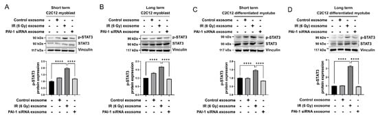 Exosomal PAI-1 activated intracellular STAT3 in differentiated myotubes. (A–D) The protein expression of phosphorylated STAT3 was assessed by western blot in C2C12 myoblast cell, C2C12 differentiated myotube cell treated with U87MG exosome in the short-term or long-term (upper panel). p-STAT3 level was quantified (lower panel). Statistical analysis was performed with one-way ANOVA plus Tukey’s multiple comparisons test. **** p < 0.0001.
