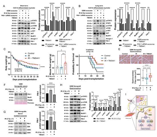 Pharmacological inhibition of PAI-1 rescued IR-induced GBM cachexia. (A,B) The protein expression of muscle protein synthesis (p-mTOR, p-AKT), muscle protein degradation (MuRF1, Atrogin-1) related proteins, upstream pathway (p-STAT3, STAT3), and PAI-1 protein in C2C12 myoblast cell, C2C12 differentiated myotube treated with U87MG exosome and TM5441, PAI-1 inhibitor in the short-term or long-term were assessed by western blot (left panel). p-STAT3, p-mTOR, p-AKT, MuRF1, Atrogin-1, PAI-1 protein were quantified (right panel). (C) Mouse body weights change in three groups of mice; U87MG-luciferase cell xenograft group, U87MG-luciferase cell xenograft plus IR (2 Gy × 5) treated group, U87MG-luciferase cell xenograft plus IR (2 Gy × 5) plus TM5441 treated group. (left panel). The final body weights of the mice were measured (right panel). (D) Survival analysis of three groups of mice; U87MG-luciferase cell xenograft group, U87MG-luciferase cell xenograft plus IR (2 Gy × 5) treated group, U87MG-luciferase cell xenograft plus IR (2 Gy × 5) plus TM5441 treated group. Survival analysis was performed by Kaplan-Meier curves and log-rank (Mantel-Cox) test (E) Size of gastrocnemius fiber from three groups of mice; U87MG-luciferase cell xenograft group, U87MG-luciferase cell xenograft plus IR (2 Gy × 5) treated group, U87MG-luciferase cell xenograft plus IR (2 Gy × 5 plus TM5441 treated group. Scale bars, 100 µm (upper panel). Myofiber cross-sectional area size in gastrocnemius was measured by ImageJ (lower panel). (F) Protein levels of PAI-1, NeuN and PSD95 (controlled by ponceau) were analyzed by western blot in xenografts serum (left panel). PAI-1 protein level was quantified (right panel). (G) Protein levels of PAI-1, CD9, CD63 and CD81 were analyzed by western blot in isolated exosomes from xenografts serum (left panel). PAI-1 protein level was quantified (right panel). (H) The protein expression of muscle protein synthesis (p-mTOR, p-AKT), muscle protein degradation (MuRF1, Atrogin-1) related proteins, upstream pathway (p-STAT3, STAT3), and PAI-1 protein in Xenografts gastrocnemius treated with IR or TM5441 were assessed by western blot (left panel). p-STAT3, p-mTOR, p-AKT, MuRF1, Atrogin-1, PAI-1 protein was quantified by imageJ (right panel). (I) Schematic diagram depicting that exosomal PAI-1 induces ionizing radiation-adaptive GBM cachexia by regulating the intracellular STAT3 pathway. Statistical analysis was performed with one-way ANOVA plus Tukey’s multiple comparisons test. ns: nonsignificant, * p < 0.05, ** p < 0.01, *** p < 0.005, **** p < 0.0001.