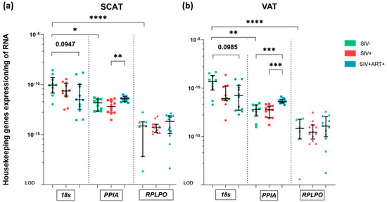 Housekeeping gene selection. Real-time quantitative PCR (RT-qPCR) analysis of the RNA expression of three housekeeping genes (18S, PPIA, and RPLPO). The level of gene expression was normalized against the total amount of RNA extracted from each sample. The limit of detection (LOD) corresponds to the difference after 50 cycles, i.e., a minimum detectable ratio of 10−20 after normalization against the total amount of RNA (a,b) RNA expression of 18S, PPIA and RPLPO housekeeping genes within SCAT (a) and VAT (b) in the SIV− (green) (18s and PPIA n = 10, RPLPO n = 7), SIV+ (red) (n = 12) and SIV+ART+ (blue) (n = 12) groups. The results are quoted as the median [IQR]. Kruskal–Wallis tests associated with Dunn’s multiple comparison test or Mann–Whitney tests were used for unpaired and paired comparisons, respectively. Only statistically significant results are shown: * p < 0.05, ** p < 0.005, *** p < 0.001, **** p < 0.0001.