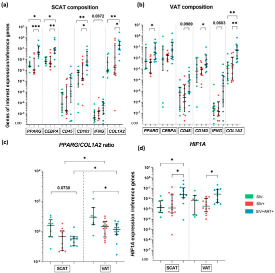 Gene expression analysis of AT components, at the whole-tissue level. RT-qPCR analysis of the mRNA expression of genes specifically transcribed in adipocytes (PPARG and CEBPA), hematopoietic cells (CD45), immune cells (CD163 and IFNG), and ECM (COL1A2) within SCAT and VAT and in the three groups of animals: SIV− (green), SIV+ (red), and SIV+ART+ (blue). Expression of the genes of interest was compared with that of the 18S and PPIA housekeeping genes. The LOD was set to the difference vs. the mean level of housekeeping gene expression after 20 cycles, i.e., a 10 −8-fold difference. (a,b) The composition of SCAT (a) and VAT (b) in the SIV−, SIV+ and SIV+ART+ groups. (c) The PPARG/COL1A2 ratio in the SIV−, SIV+ and SIV+ART+ groups in SCAT (left) and VAT (right). (d) mRNA expression of HIF1A within SCAT (left) and VAT (right) in the SIV−, SIV+, SIV+ART+ groups. The results are quoted as the median [IQR]. Kruskal–Wallis tests associated with Dunn’s multiple comparison test or Mann–Whitney tests were used for unpaired and paired comparisons, respectively. Only significant results and trends are shown: * p < 0.05, ** p < 0.005, *** p < 0.001.