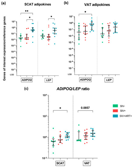 Whole-tissue gene expression analysis of adipokine production by the AT. RT-qPCR analysis of the mRNA expression of genes encoding adiponectin (ADIPOQ) and leptin (LEP) within the SCAT and VAT, in the three groups of animals: SIV− (green), SIV+ (red), and SIV+ART+ (blue). Expression of the genes of interest was compared with that of the 18S and PPIA housekeeping genes. The LOD was set to the difference vs. the mean level of housekeeping gene expression after 20 cycles, i.e., a 10− −8-fold difference. (a,b) mRNA expression of ADIPOQ and LEP in SCAT (a) and VAT (b) in the three groups. (c) The ADIPOQ/LEP ratio in the three groups and within the SCAT (left) and VAT (right). The results are quoted as the median [IQR]. Kruskal–Wallis tests associated with Dunn’s multiple comparison test or Mann–Whitney tests were used for unpaired and paired comparisons, respectively. Only significant results and trends are shown: * p < 0.05, ** p < 0.005.