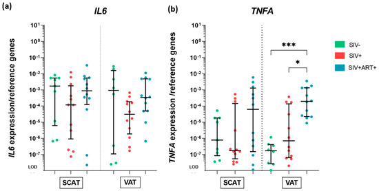 Gene expression analysis of cytokine production by the AT, at the whole-tissue level. RT-qPCR analysis of the mRNA expression of genes encoding the proinflammatory cytokines IL-6 and TNF-α within SCAT and VAT in the three groups of animals: SIV− (green), SIV+ (red), and SIV+ART+ (blue). The expression of the genes of interest was compared with that of the 18S and PPIA housekeeping genes. The LOD was set to the difference vs. the mean level of housekeeping gene expression after 20 cycles, i.e., a 10 −8-fold difference. (a) Expression of IL6 in SCAT (left) and VAT (right) in the three groups. (b) mRNA expression of TNFA in SCAT (left) and VAT (right) in the three groups. The results are quoted as the median [IQR]. Kruskal–Wallis tests associated with Dunn’s multiple comparison test or Mann–Whitney tests were used for unpaired and paired comparisons, respectively. Only significant results and trends are shown: * p < 0.05, *** p < 0.001.