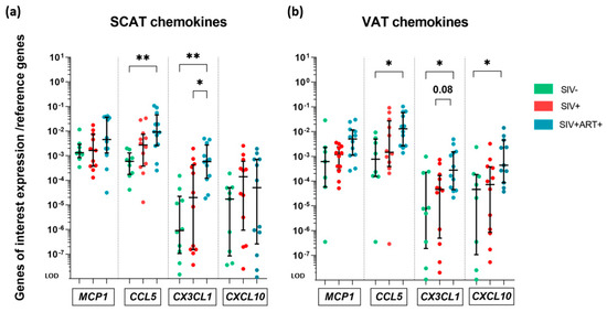 Gene expression analysis of AT chemokine production, at the whole-tissue level. RT-qPCR analysis of the mRNA expression of genes encoding MCP-1, CCL5, CX3CL1 and CXCL10 chemokines within the SCAT and VAT in the three groups of animals: SIV− (green), SIV+ (red), and SIV+ART+ (blue). Expression of the genes of interest was compared with that of the 18S and PPIA housekeeping genes. The limit of detection (LOD) was set to the difference vs. the mean level of housekeeping gene expression after 20 cycles, i.e., a 10−8-fold difference. (a,b) Expression of MCP1, CCL5, CX3CL1 and CXCL10 within SCAT (a) and VAT (b) in the three groups. The results are quoted as the median [IQR]. Kruskal–Wallis tests associated with Dunn’s multiple comparison test and Mann–Whitney tests were used for unpaired and paired comparisons, respectively. Only significant results and trends are shown: * p < 0.05, ** p < 0.005.