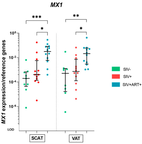 AT is also characterized by its production of type I IFN, although the latter’s exact biological role in this tissue has yet to be fully characterized [42,43]. However, type I interferon is highly involved in antiviral responses and as such contributes to HIV/SIV-associated inflammation. We therefore investigated the expression of MX1 (an interferon-stimulated gene (ISG)) in AT under different pathophysiological conditions. MX1 mRNA expression in both the SCAT and VAT was significantly higher in the SIV+ART+ group than in the SIV− group (with fold increases of 157 in SCAT and 41 in VAT) and the SIV+ group (with fold increases of 77 in SCAT and 28 in VAT) (Figure 6).