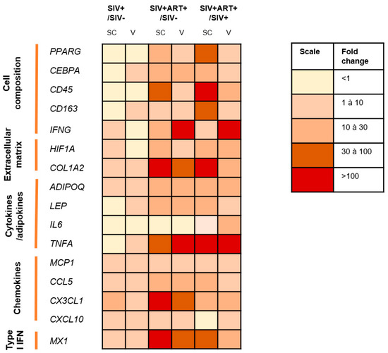 Summary of observed differences in cell composition, inflammatory profile, chemokine expression and interferon-stimulated gene expression within SCAT and VAT. Level of changes (ratio of expression medians) in cell composition, inflammatory profile, chemokine and ISG expression within SCAT and VAT are shown by color gradient for the SIV+/SIV−, SIV+ART+/SIV−, and SIV+ART+/SIV+ groups (expression scale on the right of the table). Each group was compared with the two others.