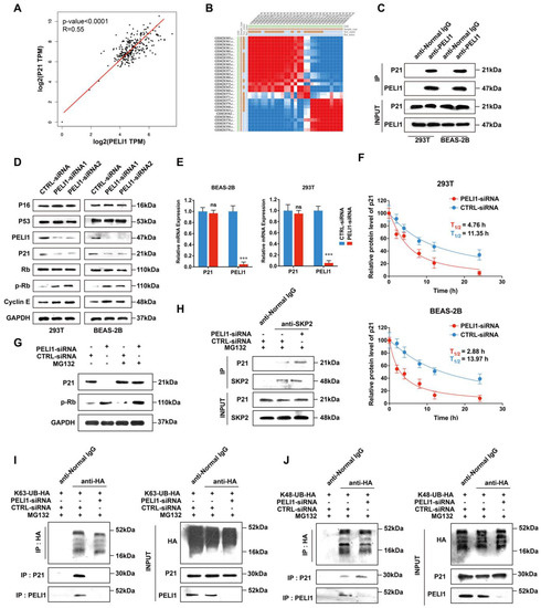 Pellino-1 regulates the degradation of p21 via K63-site ubiquitination. (A) The relationship between PELI1 and p21 was significant in the GTEx-lung database (Data represents R for relative coefficient and P for significance). (B) The column similarity matrix of PELI1 and p21 in COPD study GSE1650 showed a positive relationship in both COPD and healthy patients (Matrix values: pure blue for −1, pure red for 1). (C) Co-IP of PELI1 and p21 showed an interaction between PELI1 and p21 in both 293T and BEAS-2B cells (n = 3). (D) In 293T and BEAS-2B cells, two kinds of siRNAs of PELI1 both led to an increase in phosphorylated Rb and Cyclin E1 and a decrease in p21. P16, P53 and unphosphorylated Rb did not change significantly (n = 3). (E) The mRNA expression changes in p21 after siPELI1 did not change significantly. Data represent mean ± SEM; *** p < 0.001, ns for not significant (n = 3). (F) Quantitative analyses of p21 degradation in BEAS-2B and 293T cells after silencing of PELI1 following treatment with CHX (10 μg/mL). The half-lives (T1/2) of p21 degradation were calculated by single-phase decay analysis (n = 3). (G) Treatment with MG132 (5 μg/mL) and silencing of PELI1 led to an increase in p-Rb and did not change p21. (H) Co-IP assay showed that silencing PELI1 led to the enhanced combination of p21 and SKP2 (n = 3). (I,J) HA-tagged K48 and K63 ubiquitination sites were constructed. Silencing PELI1 led to a decrease in K63-Ub and an increase in K48-Ub combined with p21 (n = 3). Figure S1 is related to Figure 1.