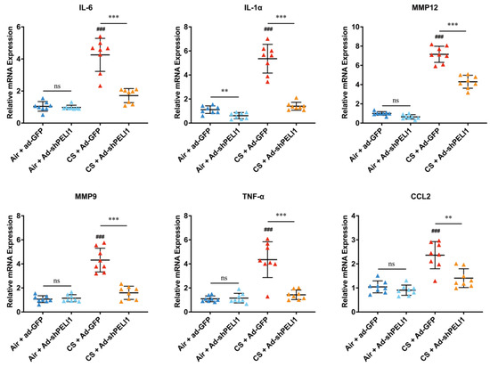 Silencing PELI1 decreased the high mRNA expression of SASPs caused by CS. ASPs including IL-6, IL-1α, MMP-9, MMP-12, TNFα, and CCL2 were significantly increased in the CS group, which could be decreased by silencing PELI1. Data represent mean ± SEM; ### p < 0.001 vs. (Air + Ad-GFP group), ** p < 0.01, *** p < 0.001 vs. (CS + Ad-GFP group), ns for not significant, n = 8 mice.