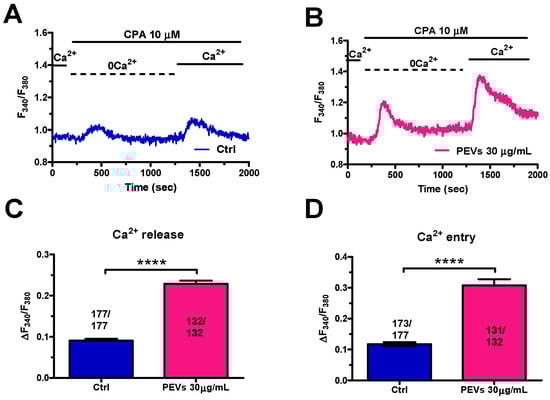 The dose-response relationship showed in a previous study from our group demonstrated that 30 µg/mL represents the PEV dose that is more efficiently internalized and is more effective at inducing migration in MDA-MB-231 cells [16,49]. The long-term effect of PEVs on intracellular Ca2+ dynamics was therefore evaluated in MDA-MB-231 cells maintained or not (control, Ctrl) in the presence of 30 µg/mL PEVs for 24 h and loaded with the Ca2+-sensitive fluorophore, Fura-2/AM. Preliminary recordings revealed that PEVs did not affect either the basal [Ca2+]i (Figure S1A) or the modest constitutive Ca2+ entry that has previously been reported in MDA-MB-231 cells (Figure S1B,C) [50]. Next, we exploited the Ca2+ add-back protocol to evaluate whether long-term exposure to PEVs influences ER Ca2+ mobilization and SOCE activation. As described elsewhere [27,28,30,37,50,51], this manoeuvre consists in stimulating the cells with cyclopiazonic acid (CPA), a selective inhibitor of SERCA, in the absence of extracellular Ca2+ (0Ca2+) to cause passive ER Ca2+ efflux through Ca2+-permeable leakage channels. Subsequently, 1.8 mM Ca2+ is restituted to external Ca2+ to monitor SOCE through Orai1 channels that have previously been activated by STIM1 upon the depletion of the ER Ca2+ store. Figure 1A,B show that CPA (10 µM) caused a transient increase in [Ca2+]i under 0Ca2+ conditions, which reflects ER Ca2+ releasing ability in the absence (Ctrl) and presence of PEVs. PEVs caused a significant (p < 0.05) elevation in CPA-evoked ER Ca2+ mobilization (Figure 1C). The following restitution of extracellular Ca2+ induced a second increase in [Ca2+]i (Figure 1A,B), which was entirely due to SOCE through Orai1 channels [27,28,30,50]. Statistical analysis revealed that long-term exposure to PEVs also increased SOCE in MDA-MB-231 cells (Figure 1D). Altogether, these findings indicate that PEVs induce a remarkable remodelling of the Ca2+ handling machinery in highly aggressive breast cancer MDA-MB-231 cells by enhancing both ER Ca2+ release and SOCE.