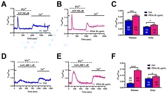 Long-term exposure of MDA-MB-231 cells to PEVs increases InsP3-induced ER Ca2+ mobilization and SOCE. (A). ATP (100 µM) evoked a transient increase in [Ca2+]i under 0Ca2+ conditions in control (Ctrl) cells. ATP was then removed from the recording bath, while extracellular Ca2+ was restored to the solution to measure SOCE. (B). The treatment of MDA-MB-231 cells with PEVs (30 μg/mL, 24 h) increased ATP-induced endogenous Ca2+ mobilization and SOCE activation. (C). Mean ± SEM of ATP-induced intracellular Ca2+ release and SOCE in control (Ctrl) and PEV-treated cells. * indicates p < 0.05 and *** indicates p < 0.001. (D). InsP3-BM, a membrane-permeant esterified form of InsP3, induced a small increase in [Ca2+]i under 0Ca2+ conditions in control (Ctrl) cells. Restoration of extracellular Ca2+, in the absence of the agonist, caused a second bump in [Ca2+]i that was indicative of SOCE activation. (E). The treatment of MDA-MB-231 cells with PEVs (30 µg/mL, 24 h) caused an enhancement in intracellular Ca2+ mobilization and SOCE in MDA-MB-231 cells stimulated with InsP3-BM. (F). Mean ± SEM of InsP3-BM-induced endogenous Ca2+ mobilization and SOCE in control (Ctrl) and PEV-treated cells. **** indicates p < 0.0001 and * indicates p < 0.05.