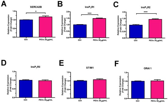In order to gain further insights into the molecular mechanisms whereby PEVs increase InsP3-induced ER Ca2+ mobilization and SOCE activity, we carried out a thorough RT-qPCR analysis of mRNAs isolated from MDA-MB-231 cells exposed or not (Ctrl) to PEVs (30 µg/mL; 24 h). Figure 3 shows a significant increase in the expression levels of the transcripts encoding for SERCA2B (Figure 3A), i.e., the major SERCA isoform in MDA-MB-231 cells [59], and for InsP3R1 (Figure 3B) and InsP3R2 (Figure 3C), which mediate ER Ca2+ release [26]. Conversely, there was no change in the expression of the transcripts encoding for InsP3R3 (Figure 3D) and for all the molecular components of the SOCE machinery in MDA-MB-231 cells, i.e., STIM1 (Figure 3E) and Orai1 (Figure 3F) [24,27,30,31]. Notably, RT-qPCR analysis of PEV transcripts did not reveal detectable levels of any of these mRNAs (data not shown), thereby showing that SERCA2B, InsP3R1, and InsP3R2 transcripts are not directly transferred to MDA-MB-231 cells from PEVs (mean Ct values ± SD of 37.5 ± 1, 38.5 ± 1, 38.2 ± 1.1, 34.9 ± 1.4, 34.8 ± 1, 37.3 ± 1.4, and 36.6 ± 1.3 for SERCA2B, InsP3R1, InsP3R3, Orai1, SERCA3, InsP3R2, and STIM1, respectively).