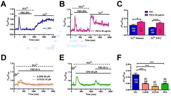 It has long been known that FBS stimulates the migration in cancer cells through an increase in [Ca2+]i [26,30,31,52,53]. FBS consists of a mixture of growth factors that bind to specific tyrosine kinase receptors (TKRs) that are coupled to PLCγ and stimulate InsP3-production and InsP3-dependent Ca2+ signalling. A recent report from our group showed that 24 h treatment with PEVs potentiated serum-evoked migration in MDA-MB-231 cells [16]. Therefore, we reasoned that the increase in the chemotactic response to FBS could be associated to an elevation in the underlying increase in [Ca2+]i. The Ca2+ add-back protocol confirmed that, upon long-term exposure to PEVs (30 µg/mL; 24 h), MDA-MB-231 cells displayed a remarkable increase in serum-evoked intracellular Ca2+ release and SOCE activation when compared to non-treated (Ctrl) cells (Figure 5A–C). The increase in extracellular Ca2+ entry was further confirmed by measuring the area under the curve (AUC) corresponding to the increase in [Ca2+]i evoked by the re-addition of extracellular Ca2+ (Figure S3). Pharmacological characterization revealed for the first time that serum-evoked intracellular Ca2+ release was mediated by ER Ca2+ release through InsP3Rs in MDA-MB-231 cells. Indeed, the intracellular Ca2+ response to 20% FBS was dramatically reduced by each of the following manoeuvres [16,37,40,63]: (1) blockade of PLCγ activity with the specific aminosteroid, U73122 (10 µM); (2) specific inhibition of InsP3Rs with 2-APB (50 µM) (Figure 5D,F); and (3) depletion of the ER Ca2+ store with CPA (30 µM) (Figure 5E,F).