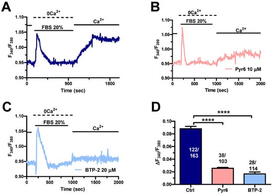In agreement with previous reports on other cancer cell types [40,52], serum-evoked SOCE (Figure 6A) was dampened by blocking Orai1 channels with either Pyr6 (10 µM) (Figure 6B,D) or BTP-2 (20 µM) (Figure 6C,D) in MDA-MB-231 cells. Taken together, these findings show that long-term exposure to PEVs leads to an increase in InsP3-induced ER Ca2+ mobilization and SOCE that could potentiate the pro-migratory Ca2+ response to serum stimulation.