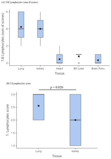 Lymphocytic infiltrates. (A) Box plot comparing the sum of the B and T lymphocyte scores across lungs, kidneys, heart, brain frontal lobe (BF), and pons (BP); the lymphocyte component within the inflammatory infiltrates of lungs and kidneys was clearly predominant over that of other tissues (p < 0.001); (B) box plot showing a comparison between T lymphocyte scores in the lungs and in the kidneys; The presence of T-B lymphocytes as a whole (sum of scores) was similar in the lungs and kidneys, albeit with a significantly greater presence of T lymphocytes in the lungs (p = 0.020).