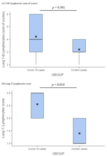Comparison of lymphocytic infiltrates among the lungs of cases and controls. (A) Box plot describing the comparison between the lung B–T lymphocyte of COVID-19 cases versus control cases; lung T-B lymphocytes (sum of scores) did not show any significant difference; (B) lung T lymphocyte score comparison among COVID-19 cases and control cases according to a box plot demonstrated that the T-component was considerably more represented in COVID-19 pneumonia (p = 0.010).