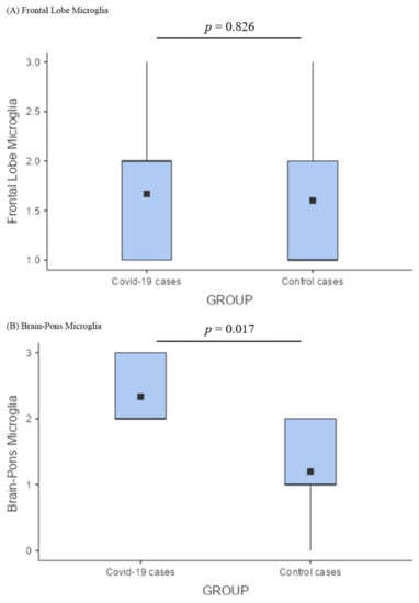 Comparison of microglial activation between the brains of cases and controls. (A) In the frontal lobe, microglial activation (innate immunity) did not differ between COVID-19 cases and controls; (B) Comparison of pontine microglia between COVID-19 cases and control cases by a box plot showed a significantly greater microglial activation in the pons of COVID-19 cases (p = 0.017).