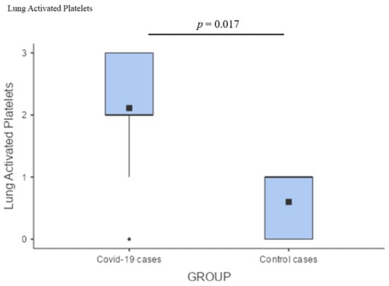 Box plot comparing activated platelets between the lungs of cases and controls demonstrating a predominance of pulmonary microthrombi in COVID-19 cases (p = 0.023).