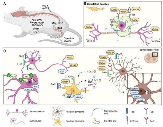 Wnt’s contributions to different pain conditions in various neuronal and non-neuronal cells. (A) Schematic representation of different pain models in mice. (B) After neuropathic pain induction, in dorsal root ganglia, activated nociceptors increase the receptors’ expression, such as TRPV1, P2X3, Na1.7, Ryk, and Fzd8, and that of Wnt-related proteins, e.g., Wnt5a, Wnt5b, Wnt3A, and Wnt10a. Likewise, in satellite cells, Fdz8 and Wnt3a are also overexpressed. (C) In the spinal dorsal horn, Wnt signaling is involved in pain sensation and acts on neuronal and non-neuronal cells. Many Fzd receptors and co-receptors (Ryk and Ror2) are upregulated in neurons, which brings about phosphorylation, activation of downstream targets (NR2B, Src, and PKC), and a Ca2+ increase. This results in increases in JNK and CaMKII and the release of Wnt3a, Wnt5a, and FKN. Astrocytes harbor large amounts of Wnt proteins and receptors, which are upregulated during pain. As a consequence, the concentration of Ca2+ rises in the cytoplasm, along with the concentrations of β-catenin, kindlin, c-JUN, and C3aR; and the release of CCL2 increases. This last chemokine triggers microglia, which in situations of pain upregulates Fzd, the LRP5/6 co-receptor, and Wnt3a. Reactive microglia increase the expression of CX3CR1, ROS/RNS, and NF-kB and the secretion of IL-1β, IL-6, TNF-α, and BDNF, which in turn escalate the inflammatory condition. ALS, amyotrophic lateral sclerosis; DPN, diabetic peripheral neuropathy; CPTP, chronic post-thoracotomy pain; CCI, chronic constriction injury; SNL, spinal nerve ligation; SNI, spared nerve injury; CFA, complete Freund’s adjuvant; inj., injection; Fzd, Frizzled; FKN, Fractalkine; P, phosphorylation; NR2B, N-methyl-D-aspartate receptor subunit 2B; JNK, c-Jun amino (N)-terminal kinase; Src, Proto-oncogene tyrosine-protein kinase; PKC, protein kinase C; CaMKII, Ca2+/calmodulin-dependent protein kinase II; CCL2/MCP1, CC-chemokine ligand 2; ROS/RNS, reactive oxygen species/reactive nitrogen species; NF-kB, Nuclear factor kappa-light-chain-enhancer of activated B cells; BDNF, brain-derived neurotrophic factor; c-JUN, transcription factor Jun; C3aR, complement component 3 fragment a receptor; LRP5/6, low-density lipoprotein receptor-related protein 5/6; Ryk, receptor-like tyrosine kinase; Ror2, receptor tyrosine kinase-like orphan receptor 2; CX3CR1, CX3C chemokine receptor 1; IL, interleukin; TNF-α, tumor necrosis factor alpha.