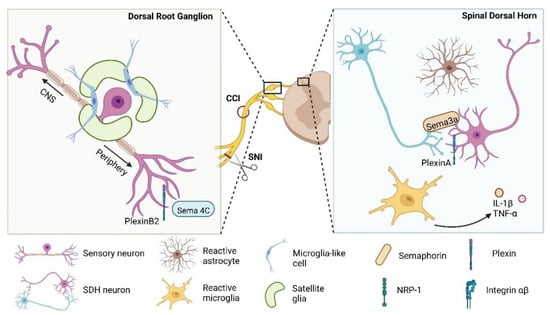 Semaphorin–plexin signaling in mice model of pain. Schematic representation of known semaphorins and their receptor expressed in dorsal root ganglia and the spinal dorsal horn after nerve injury in pain models of mice. CCI, chronic constriction injury; SNI, spared nerve injury; NRP-1, Neuropilin-1; Sema, Semaphorin; IL-1β, Interleukin-1β; TNF-α, Tumor necrosis factor alpha.