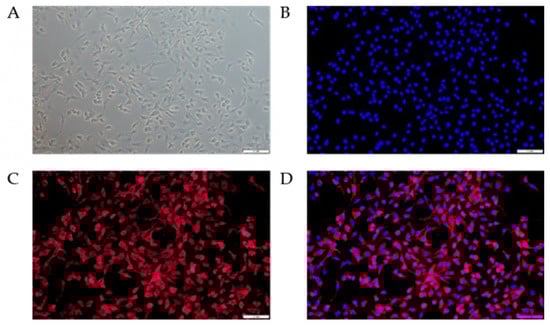 Phenotypic verification of bMECs by immunofluorescence with Cytokeratin 18 (200×). (A) Bright field. (B) DAPI staining. (C) Immunofluorescence with Cytokeratin 18 labeled with Cy3. (D) Merge of B and C.