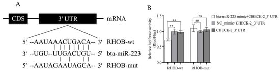 Bta-miR-223 directly targets the RHOB gene by binding to its 3′ UTR. Because RHOB-wt and RHOB-mut are the experimental results of two dishes of cells, the final data were normalized. (A) Predicted bta-miR-223 binding sites and experimentally introduced mutations within the RHOB 3′ UTR are shown. (B) Verification of the presence of the bta-miR-223 binding site in the RHOB 3′UTR by a dual-luciferase reporter assay. The experimental results are displayed as the mean ±SEM. ** p < 0.01, ns p > 0.05. CDS = coding Sequence; NC_mimic = negative control, compared with bta-miR-223 mimic; RHOB-wt = wild type of RHOB target site; RHOB-mut = RHOB sentinel mutation; CHECK-2_3′ UTR = dual-luciferase reporter recombinant vectors RHOB-wt-3′ UTR or RHOB-mut 3′ UTR and psi-CHECK-2; Rluc/Fluc = Renilla luciferase/firefly luciferase.