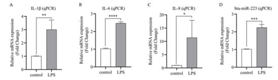 Establishment of inflammatory cell model and bta-miR-223 expression assay. (A,B,C)Expression of three inflammatory factors (IL-1β, IL-6 and IL-8) were significantly up-regulated in LPS-stimulated bMECs, indicating successful inflammatory cell model establishment. (D) Bta-miR-223 expression was significantly up-regulated in LPS-induced inflammation. The qPCR technique was used to detect the expression of each gene. The experimental results are displayed as the mean ±SEM. * p < 0.05, ** p < 0.01, *** p < 0.001, **** p < 0.0001.