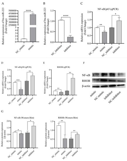 Bta-miR-223 inhibits the expression of RHOB and NF-κB in bMECs. The bMECs were transfected with bta-miR-223 mimic or NC_mimic, or either inhibitor or NC_inhibitor. Then, 48 h after transfection, the expression levels of genes and proteins were detected by performing qPCR and Western blot, respectively. (A) The transfection efficiency of bta-miR-223 mimic was detected by performing qPCR. (B) The transfection efficiency of bta-miR-223 inhibitor was detected by performing qPCR. (C) qPCR analysis of NF-κB/p65 in bMECs transfected with bta-miR-223 mimic or inhibitor. (D) qPCR analysis of NF-κB/p50 in bMECs transfected with bta-miR-223 mimic or inhibitor. (E) qPCR analysis of RHOB in bMECs transfected with bta-miR-223 mimic or inhibitor. (F,G) Western blot analysis of NF-κB and RHOB protein level expressions in bMECs transfected with bta-miR-223 mimic or inhibitor. Western blot images of NF-κB and RHOB from the same total protein were analyzed using Image J software. The density quantification of Western blot was normalized to that of the same batch β-actin in order to perform a comparative analysis. The experimental results are displayed as the mean ± SEM. * p < 0.05, ** p < 0.01, *** p < 0.001, **** p < 0.0001.