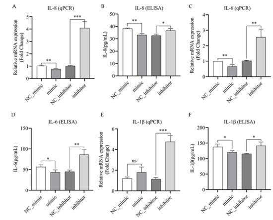 Bta-miR-223 inhibits the production of IL-1β, IL-8 and IL-6 in bMECs. The bMECs were transfected with bta-miR-223 mimic or negative control (NC_mimic) and bta-miR-223 inhibitor or negative control (NC_inhibitor). bMECs were stimulated with LPS for 6 h. Then the cells were collected, and the expression levels of IL-8 (A,B), IL-6 (C,D) and IL-1β (E,F) mRNA and secretion levels of inflammatory factors were detected. qPCR and ELISA were used to detect the expression of inflammatory factors in each group of cells at the mRNA and secretory levels, respectively. The experimental results are displayed as the mean ±SEM. ns p > 0.05, * p < 0.05, ** p < 0.01, *** p < 0.001.