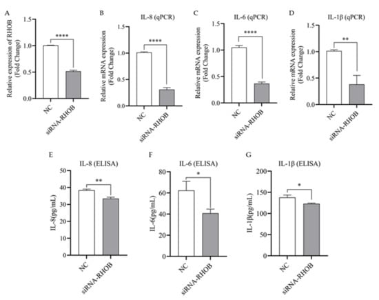 To further confirm that bta-miR-223 inhibits the expression of inflammatory factors at the mRNA and secretion levels by regulating RHOB, an interference test of RHOB in bMECs was conducted and analyzed by qPCR and ELISA to detect inflammatory markers before and after silencing RHOB in bMECs. The results show that transfection of siRNA-RHOB resulted in a 50.1% down-regulation of RHOB gene expression in bMECs (p < 0.0001, Figure 6A). Silencing of RHOB significantly inhibited the expression of IL-8, IL-6 and IL-1β gene expression (p < 0.01, Figure 6B–D), and also significantly suppressed the secretion of the respective proteins in bMECs (p < 0.05, Figure 6E–G). Therefore, the above results indicate that silencing RHOB inhibits the release of inflammatory factors in bMECs, which is consistent with the results of the bta-miR-223 mimic group, resulting in the attenuation of the inflammatory response in bMECs.