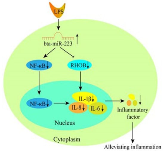 Summary of the mechanism of action of bta-miR-223 in bMEC inflammation. In the LPS-stimulated bMEC response, high expression of bta-miR-223 suppresses the expression of its target genes, RHOB and NF-κB at the protein level, ultimately leading to inhibition of the inflammatory factors IL-1β, IL-8 and IL-6 at the transcriptional and translational levels, thereby alleviating the inflammatory response in bMECs.