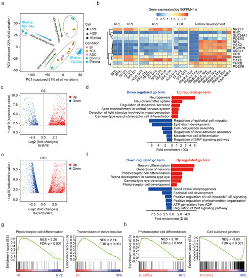 To comprehensively investigate the molecular changes during reprogramming, RNA-seq was performed on the cells at the initial (D0, HDF, and RPE cells), early (D3, with 5F and 5FA induction), and late stages of reprogramming (D10, with ASO, 5F, and 5FA induction). Principal component analysis (PCA) distinguished each type of the CiPCs well based on their cell origins, and both followed a reprogramming path similar to fetal retina development (Figure 3a, Supplementary Figure S4a,b), revealing the effective reshaping of the transcriptional profile. In particular, the photoreceptor genes showed higher expression levels in R-CiPCs than in H-CiPCs (Figure 3b).