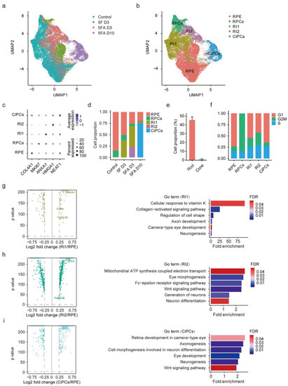 Single-cell analysis elicits homogeneous groups of cells during induction. (a,b) Uniform manifold approximation and projection (UMAP) analysis of single-cell transcriptomes from 23,661 cells annotated by treatment condition (a) and cell type (b), showing five cell clusters based on gene expression (each point represents a single cell). RPCs, retinal progenitor cells. (c) Dot plot showing marker genes identified in each cell subtype. (d) Bar plot showing the proportion of each cell subtype in different treatment conditions. (e) Bar plot showing the cell proportion of rod and cone photoreceptors inferred from scRNA-seq datasets. The proportion was determined by the percentage of cells with a positive rod score or cone score. (f) Bar plot showing the proportion of cell-cycle phases in each cell subtype. (g) Identification of the DEGs in RI1 compared with RPE (left) and the corresponding GO analysis (right). (h) Identification of the DEGs in RI2 compared with RPE (left) and the corresponding GO analysis (right). (i) Identification of the DEGs in CiPCs compared with RPE (left) and the corresponding GO analysis (right).
