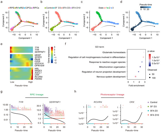 Trajectory and pseudo-time analysis identify dynamic changes along with the commitment to CiPCs. (a–d) Single-cell pseudo-time trajectory analysis using Monocle2. Cells on the tree are colored by cell type (a), treatment condition (b), state (c), and pseudo-time (d). The arrangement of cells on the trajectory from left to right (arrow) reveals the epithelium to retinal neuron transition. Cell states (c) are calculated by Monocle2 based on their pseudo-time values. (e) Heatmap of genes showing significant differential in pseudo-time-dependent expression. (f) GO analysis of genes showing significant differential pseudo-time-dependent expression. (g) Kinetic curves for RPE lineage genes TYR and SERPINF1. (h) Kinetic curves for photoreceptor lineage genes RCVRN and CRX.