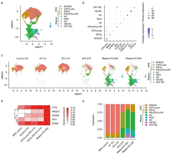 To investigate the similarity of CiPCs derived from fetal RPE cells and human developing photoreceptor cells, we further compared our scRNA-seq datasets with the results from human fetal retina (fRetina) at fetal day (FD) 125, when all major retinal cell types, including photoreceptors, are present [55]. Through integrating the datasets and projecting them onto a single UMAP plot, nine distinct clusters were obtained (Figure 7a,b). Among them, seven clusters were previously well-defined in fRetina, including retinal progenitor cells (RPCs), photoreceptors (PR), amacrine cells (AC), retinal ganglion cells (RGC), horizontal cells (HC), ON bipolar cells (ON BC), and OFF bipolar cells (OFF BC). The intermediates (RI1 and RI2) and RPE cells could not be distinguished well, while CiPCs could be subsequently divided into two groups: CiPCs-precursors (CiPCs-pre) and CiPCs-photoreceptors (CiPCs-PR). Compared with RPE cells and RI, CiPCs-PR were closer to the photoreceptor subtypes in fRetina with higher expression levels of photoreceptor marker genes (Figure 7c,d). Furthermore, this combination enabled us to identify the proportion of photoreceptor-like cells in the D10 samples (Figure 7e). Cell proportion analysis showed that photoreceptors (CiPCs-PR) constituted about 28.3% of all the cells (724 out of 2552) in the D10 sample.