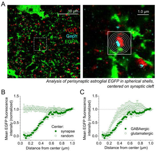 2.2. Astrocytic Volume Distribution at GABAergic and Glutamatergic Synapses