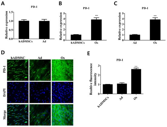 Relative PD-1 expression levels in differentiated cells derived from hADMSCs. (A) Relative mRNA expression level of PD-1 in adipocytes (Ad) and (B) osteoblasts (Os) compared with hADMSCs (human adipose-derived mesenchymal stem cells). (C) Variance in the expression level of PD-1 in differentiated cells. N = 3 trials per sample and control. (D) Cells were stained with PD-1 (green); DAPI was used to stain the nuclei (blue). (E) Relative fluorescence intensity of PD-1 receptor on cell surface of differentiated cells. N = 5 trials per sample and control. Data are presented as mean ± SEM. *** p < 0.001, compared with the hADMSCs and Ad group. hADMSCs: human adipose-derived mesenchymal stem cells; Ad: adipocytes; Os: osteoblasts.