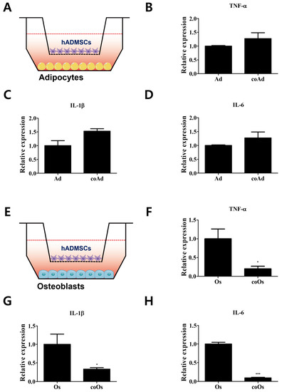 Regulation of the expression levels of proinflammatory cytokines in differentiated cells cocultured with hADMSCs. (A) Differentiated adipocytes were cocultured with hADMSCs. Relative mRNA expression levels of (B) TNF-α, (C) IL-1β, and (D) IL-6. (E) Differentiated osteoblasts were cocultured with hADMSCs. Relative mRNA expression levels of (F) TNF-α, (G) IL-1β, and (H) IL-6. N = 3 trials per sample and control. Data are presented as mean ± SEM. * p < 0.05 and *** p < 0.001, compared with the Os group. hADMSCs: human adipose-derived mesenchymal stem cells; Ad: adipocytes; coAd: cocultured adipocytes; Os: osteoblasts; coOS: cocultured osteoblasts.