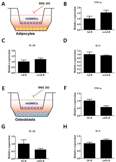 To examine whether the PD-1/PD-L1 axis is involved in the decrease in proinflammatory cytokine expression in cocultured osteoblasts, PD-1/PD-L1 interaction was inhibited by BMS 202 (Figure 3). Expression levels of TNF-α, IL-1β, and IL-6 in cocultured adipocytes were maintained, even when PD-1/PD-L1 interaction was inhibited (Figure 3A–D). However, the decreased expression of proinflammatory cytokines in cocultured osteoblasts was attenuated upon inhibition of the PD-1/PD-L1 axis, after which no significant difference between cocultured and monocultured osteoblasts was detected (Figure 3E–H). We ruled out any effect which can affect the cells by showing the changes in the expression levels of proinflammatory cytokines upon BMS202 treatment in monocultured osteoblasts (Figure S3). The changes upon BMS treatment were not statistically significant compared with non-treated cells and confirmed that the action observed was via the inhibition of PD-1/PD-L1 axis. Taken together, we assume that the elevated expression of PD-1 in differentiated osteoblasts interacted with PD-L1 secreted by hADMSCs in cocultured environments, thereby eliciting an immunosuppressive response in osteoblasts.